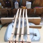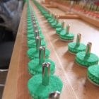 弦の高さや間隔を揃える部品、「アグラフ」を合わせていきます。仮に入れていきますが、ネジ込みで良い位置にくるものを一つずつ合わせていきます。数十本いれてやっと「キタ〜」ってなることもしばしば。