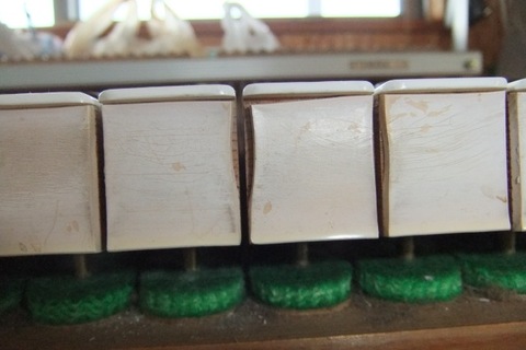 白鍵の小口(手前)が変色、変質してひどい所は形も歪んでしまっていましたので、全て剥がして貼りかえました。