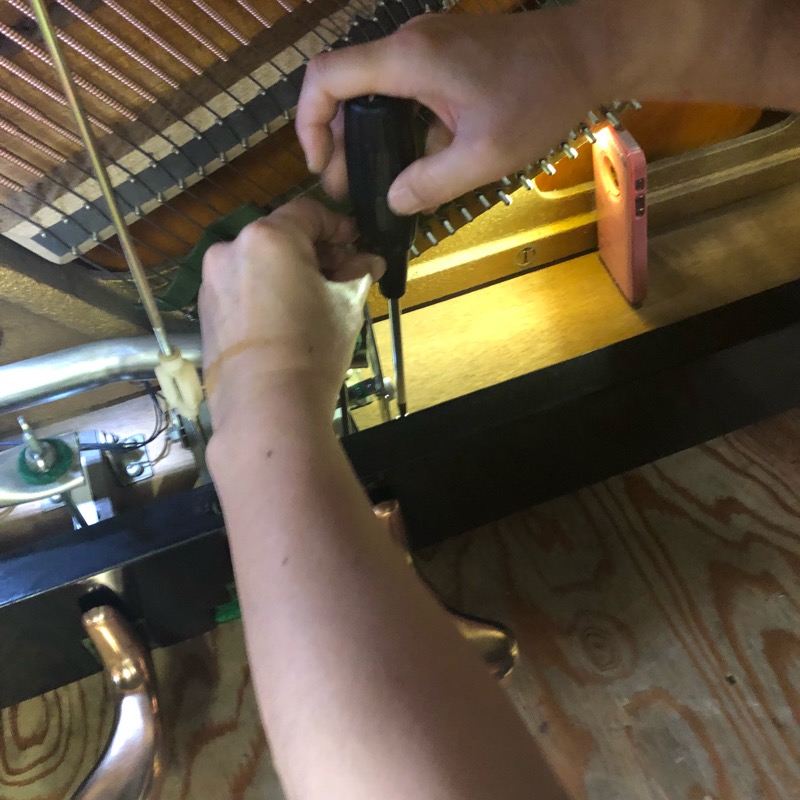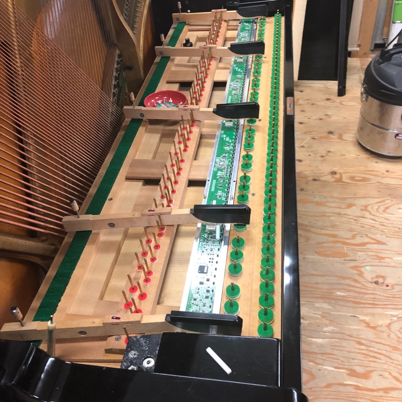 ここまで順調でしたが最高音(88鍵)の鍵盤に問題が発覚・・・。丁寧にピアノを作っていた時代は88鍵って他の鍵盤よりも重いので軽量化のために鍵盤の裏側を削ってあります。ちょうど削られた部分に反射シートを貼らなくてはなりません。「そんなに簡単にいくわけないか〜」とメーカーさん相談。