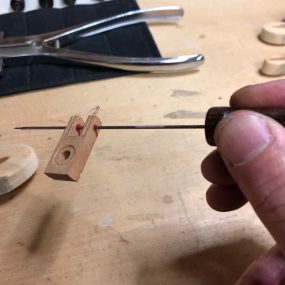 リーマーとセンターピンは0.025mmごとに違うサイズの物を使用しています。精密さが必要な作業ですが、この作業はとても難易度が高いと私は思います。言葉は悪いですが「テキトー」にやっていて「動けばOK」的な同業者が多く見られます。1級ピアノ調律技能検定の試験科目にもありますが、私は100点満点でしたよ(笑)